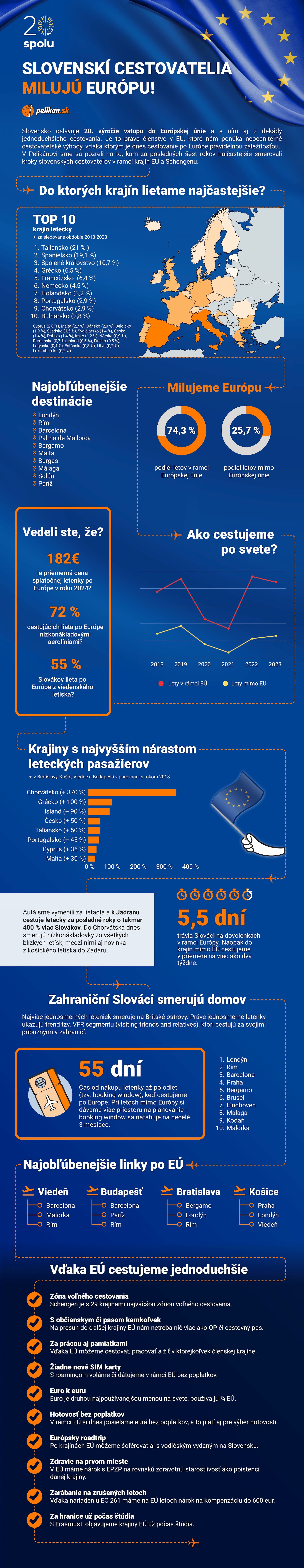 Bratislava, 30. apríla 2024 – Slovensko oslavuje 1. mája 2024 20. výročie vstupu do Európskej únie. Práve členstvo v Únii prináša Slovákom množstvo cestovateľských výhod, medzi nimi aj Schengenský priestor – najväčšiu zónu voľného cestovania. Aj vďaka tomu je Európa pre Slovákov cieľovou destináciou číslo jeden. Podľa dát Pelikána za posledných šesť rokov (2018 – 2023) po nej cestuje 75 % všetkých dovolenkárov.